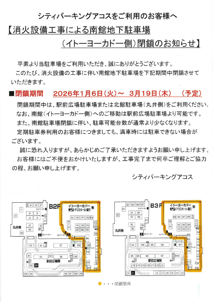 シティパーキングアコス一部閉鎖のお知らせ(1月6日(火)~3月19日(木)(予定))